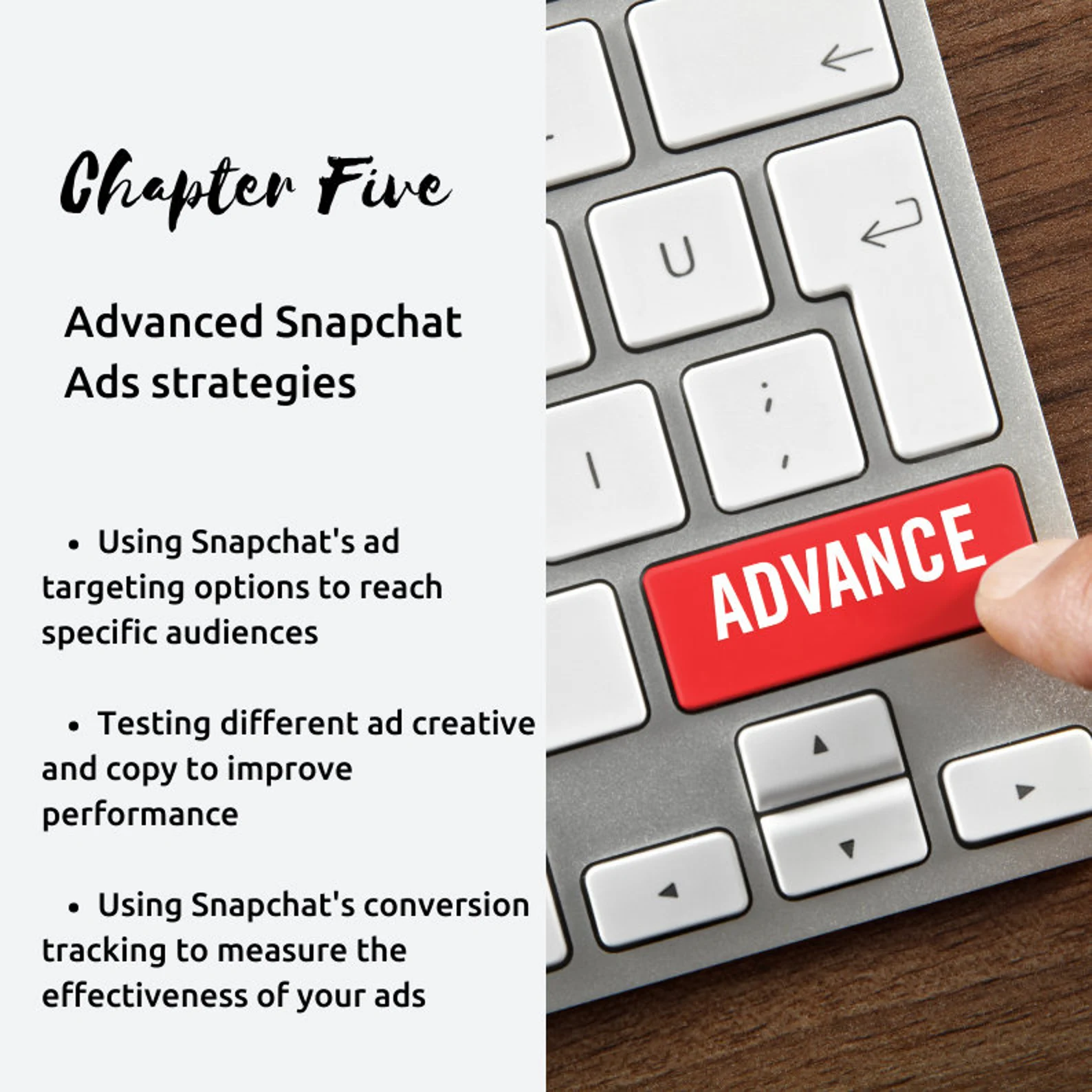 Take your skills to the next level with advanced strategies. Uncover the full potential of Snapchat’s ad targeting options, conduct A/B testing on ad creative and copy, and leverage Snapchat’s conversion tracking for unparalleled effectiveness. This chapter is your key to staying ahead of the competition.